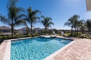 [two_third_last]Fancy a swim? The outside is breathtaking also. The wide patio deck of this rental villa is unscreened and features a crystal clear pool and relaxing hot tub surrounded by palm trees. Laze on one of the comfy sun loungers and soak up the Florida sunshine or enjoy a home cooked meal outdoors in the shade of the lanai. Stay tuned for more exciting news about this amazing rental home. [/two_third_last]