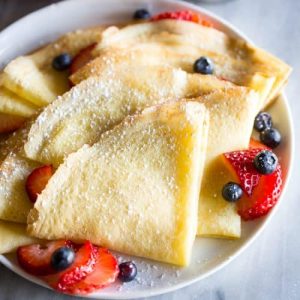 For those who are not familiar with the term pancake, you may be more familiar with the European crêpe. Traditionally, a thin, flat batter made of eggs, flour and milk, fried and served with syrup, lemon juice and sugar, Nutella or fruit and cream.[/two_third_last]
